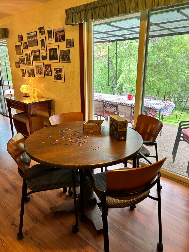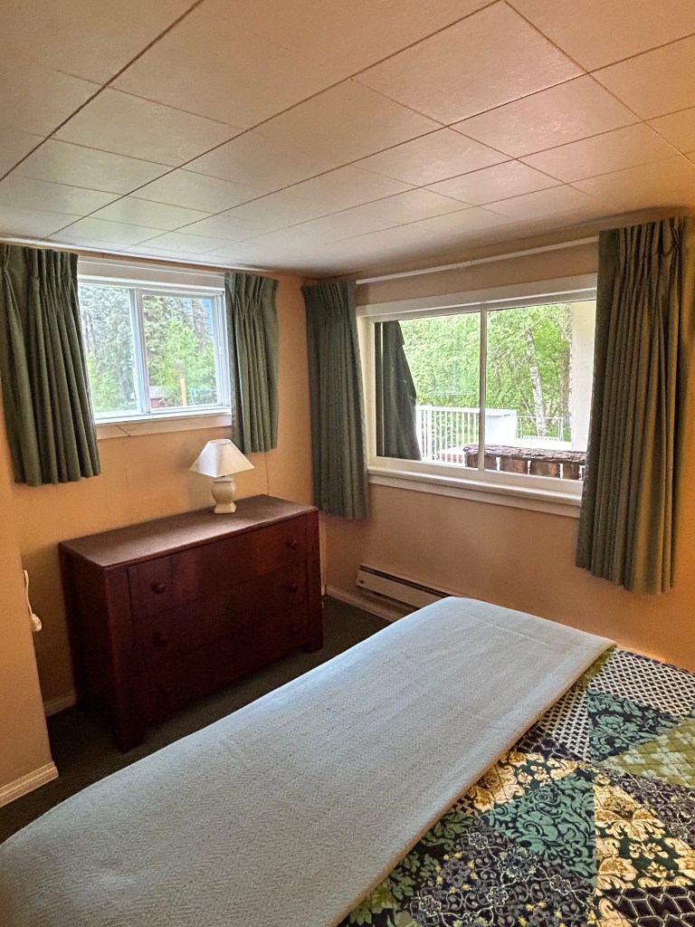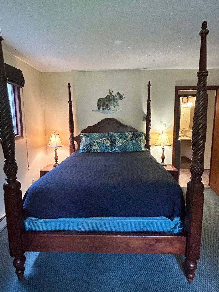 HOUSE AMENITIES include a large kitchen with new appliances and a table that comfortably seats twelve. The spacious living room features a beautiful wood burning fireplace and access to a large covered deck with a breathtaking view of the Steeples Mountain range. There are beds to accommodate fourteen people in two private bedrooms each with a queen beds, and a third large bunk room with 2 queen beds and 3 sets of bunks. There are 2 full bathrooms (1 with a tub, 1 with a shower) and lots of room to enjoy a comfortable, self-catered vacation.